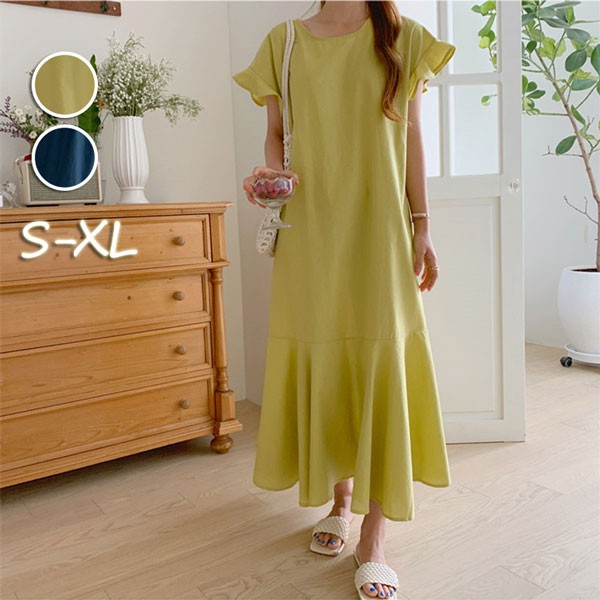 ワンピース 体型カバー 無地 夏ワンピース リゾート マーメイドライン おしゃれ リゾート 袖あり マキシ ロングワンピース 旅行 海デート 夏 オシャレ イエロー ネイビー dn047m3m3zu