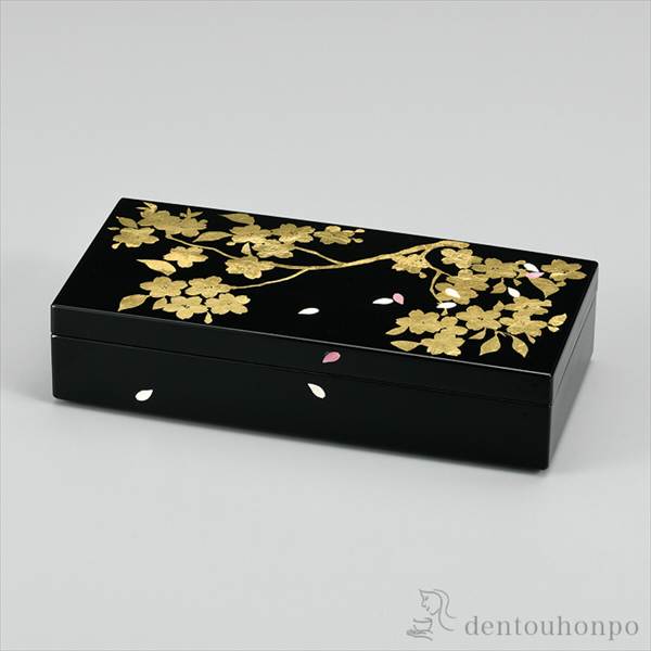 「送料無料」 長小筥 金箔さくら ( 退職祝い 定年 アクセサリー入れ 収納ボックス ケース BOX 宝物 越前漆器 結婚 出産 内祝い )