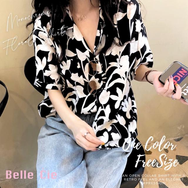 花柄 シャツ レディース 柄シャツ 半袖 半袖シャツ ブラウス 韓国ファッション 夏 トップス 春服 夏服 襟 レトロ柄 テロテロシャツ モノトーン