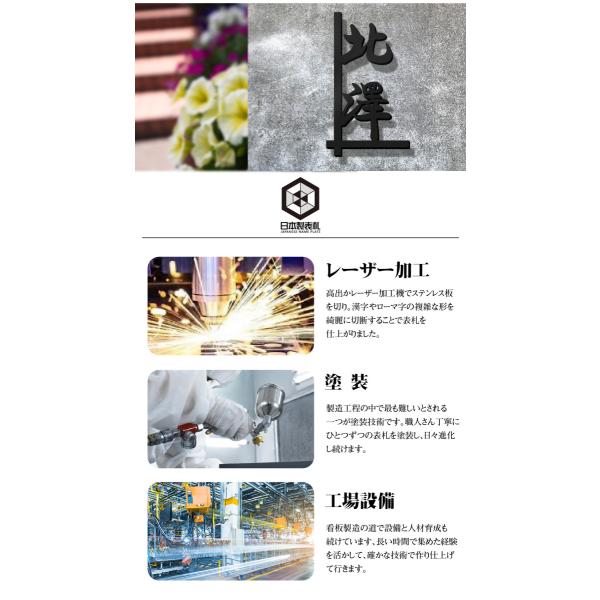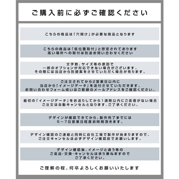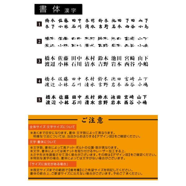 【サイズ】約H200mmx約W130mm、約H250mmx約W160mm、約H280mmx約W180mm、約H320mmx約W200mm、約H100mmx約W240mm、約H120mmx約W300mm、約H140mmx約W330mm、約H180mmx約W420mm、約H220mmx約W520mm 【文字加工方法】レーザーカット加工、スベーサー浮かせ、焼付塗装