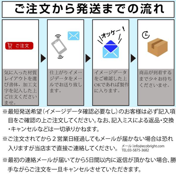 ・ご購入後に、表札の確認メールをお送りしております。 迷惑メール対策でドメイン指定受信をされているお客様は、お手数ですが [info@ecobright.jp] からお送りするメールが受信できるように設定の変更をお願いいたします。