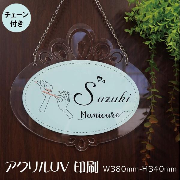 美容室看板 美容室 店名板 店名札 透かし彫り アクリル 模様 UV印刷 DIY看板 ブルー DIY 可愛い オシャレチェーン付き 人気 W380mmxH340mm 屋内外対応