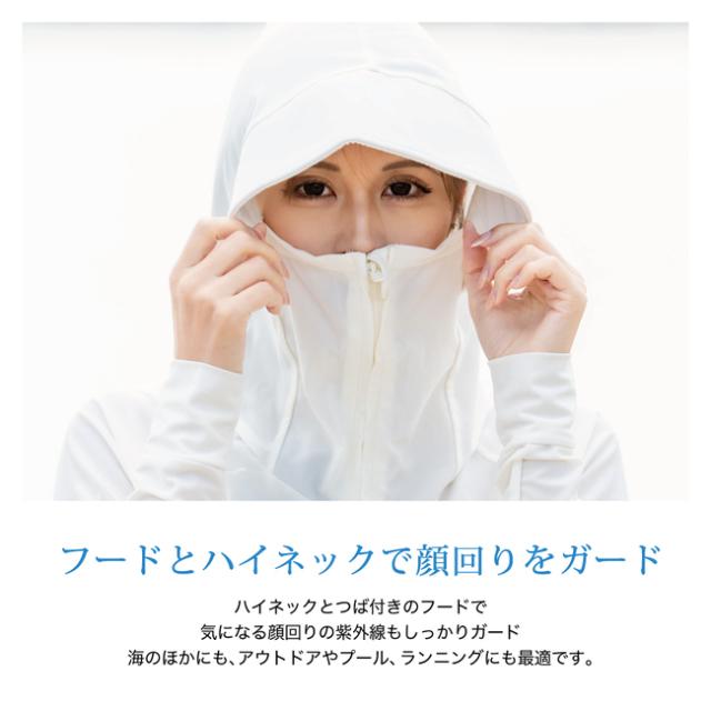 頭部を守るフードにはつばがついています。しかも、ハイネックなので気になる顔回りを紫外線からしっかりとガード!