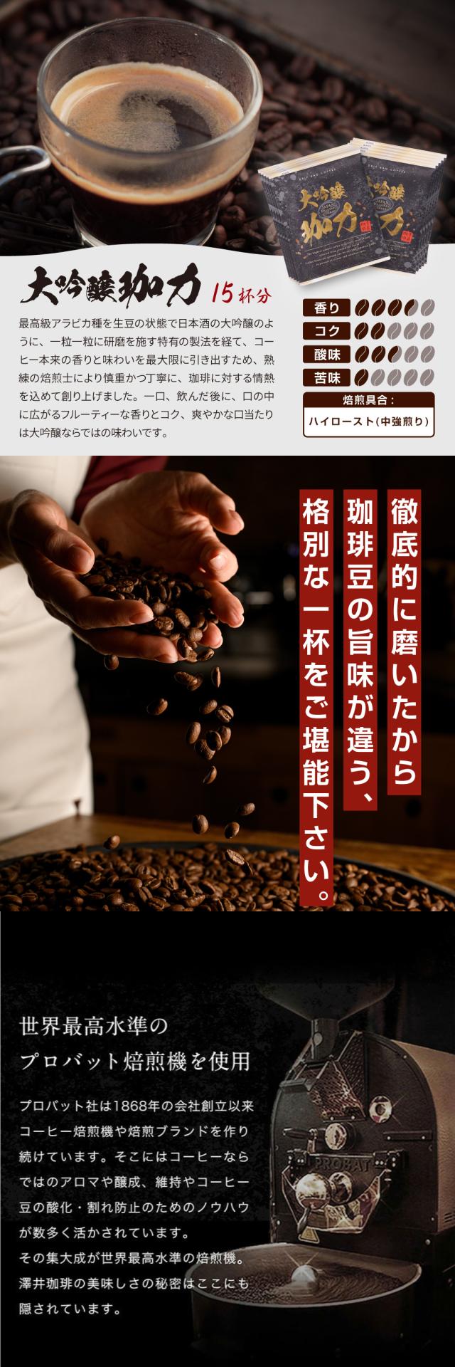 | 商品名 | 一粒一粒丁寧に研磨された大吟醸珈琲ドリップパック 15杯分 |