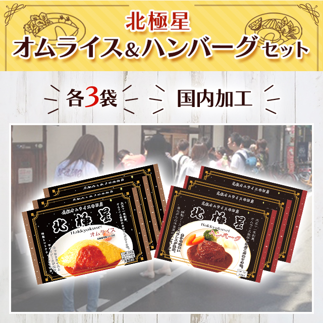 商品名 北極星 オムライス & ハンバーグ セット (各3袋) 容量 オムライス:230g(オムライス200g、別添オムライスソース30g)×3袋