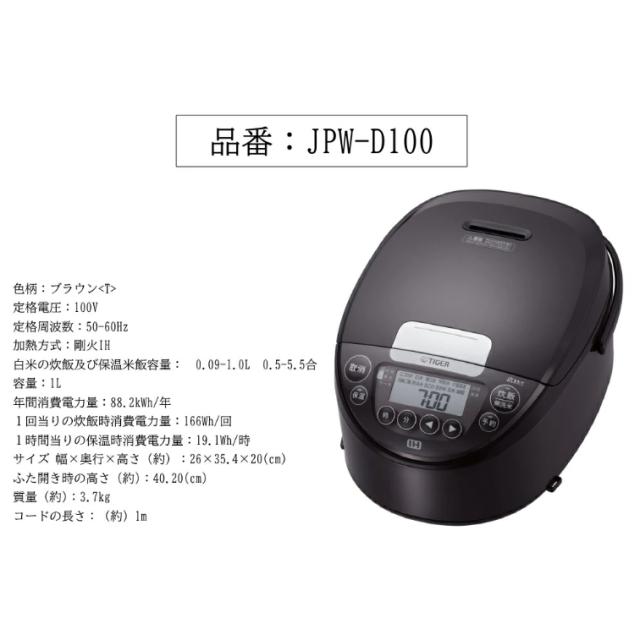 JPW-D100T タイガー炊飯器 1合 2合 3合 4合 おしゃれ キッチン家電 家電 プレゼント ギフト 一人暮らし 便利 少量高速 遠赤黒厚釜 無洗米 玄米 雑穀米 麦ごはん