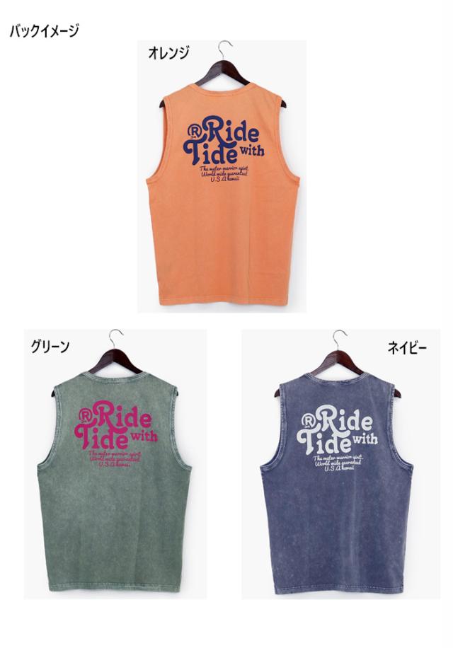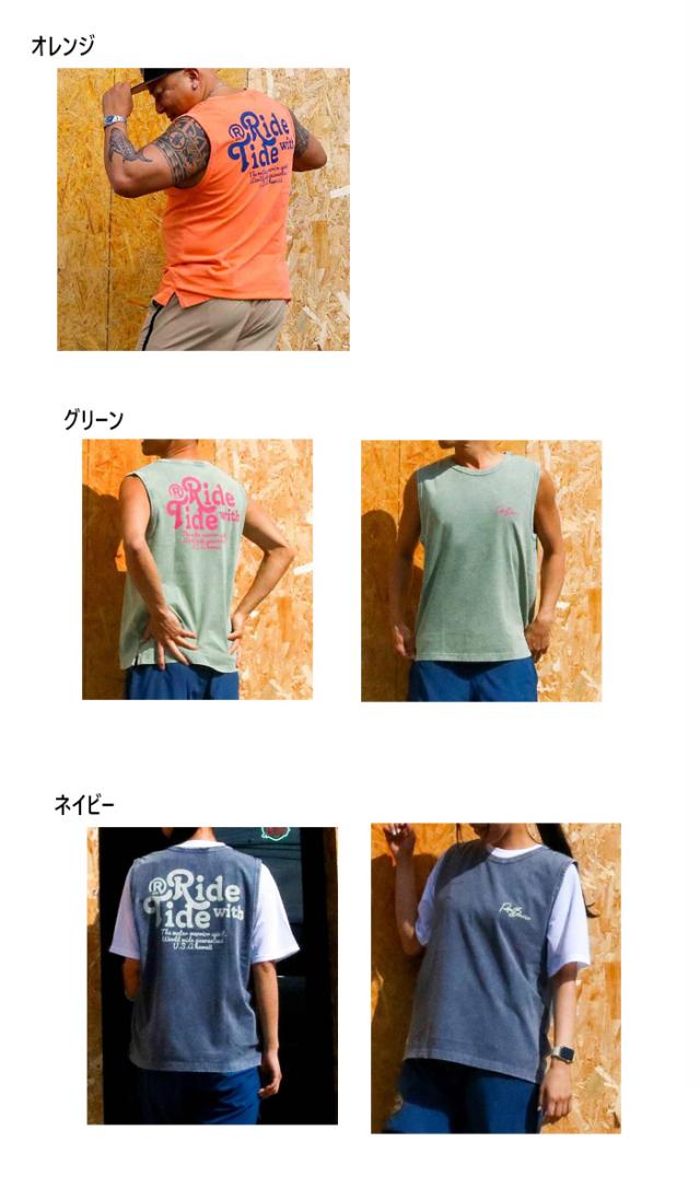 洗いざらしの雰囲気のあるノースリーブシャツです。ピグメント加工とストーンウォッシュ加工の抜け感のあるボディーは、両サイドにスリットを入れることでいつもと違うTシャツになっています。RIDE WITH TIDEのメッセージには、海の潮の満ち引きのように自然に構えてリラックスして過ごして欲しいメッセージが込められています。