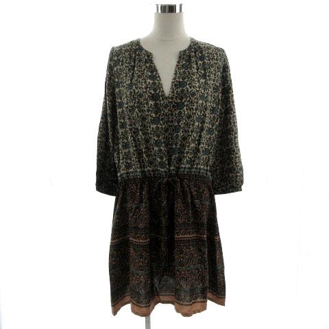 【中古】ニコアンド Niko and.. ワンピース キーネック 長袖 ミディ丈 ウエストドローコード 総柄 青系 グレージュ 茶