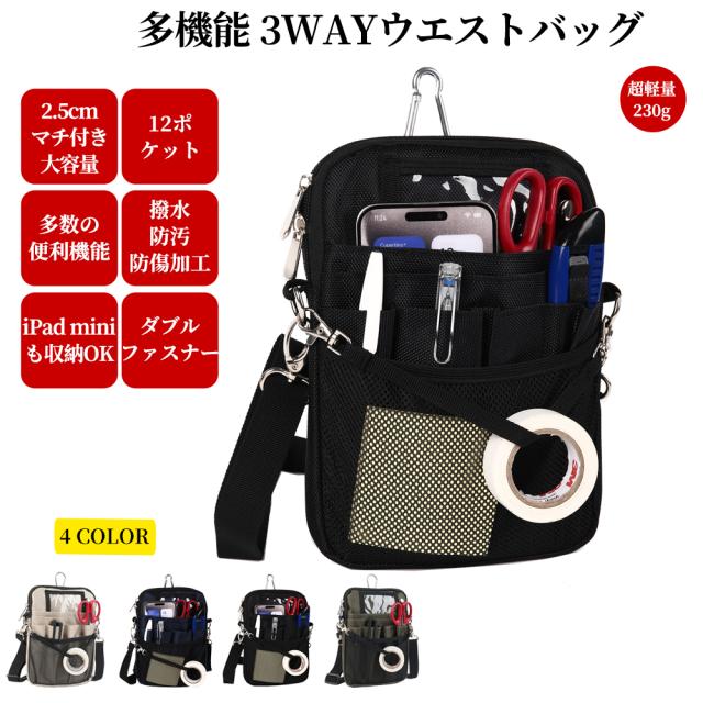 多機能 ウエストポーチ ナースポーチ ウエストバッグ オーガナイザー マチ2.5cm通常版 ダブルジッパー仕様 3way ショルダー 文具 工具バッグ 小物入れ 仕事用 作業用 業務用 看護 介護 事務 ウエストベルト・ショルダーベルト付き 撥水 防傷 12ポケット Mサイズ