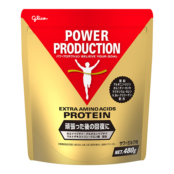 「グリコ パワープロダクション エキストラアミノアシッド プロテイン サワーミルク味 480g」は、休息時に摂りたいアミノ酸(アルギニン、オルニチン、リジン)・ビタミンB6・亜鉛・マグネシウム・セレンやハーブ(カンカ)・グリコーゲンと、体づくりのためのたんぱく質、糖質を配合しました。たんぱく質には速やかに吸収されるホエイペプチドを、糖質にはデキストリンを配合しました。コンディショニング成分として、グルタミンペプチド、クエン酸を配合しました。