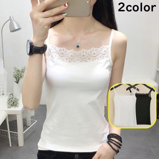 キャミソール レディース ノースリーブ カットソー 胸元レース デコルテ見せ チラ見え防止 無地 スリム シンプル カジュアル