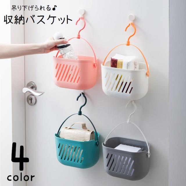 フック付きで吊り下げ収納できる収納バスケットです。