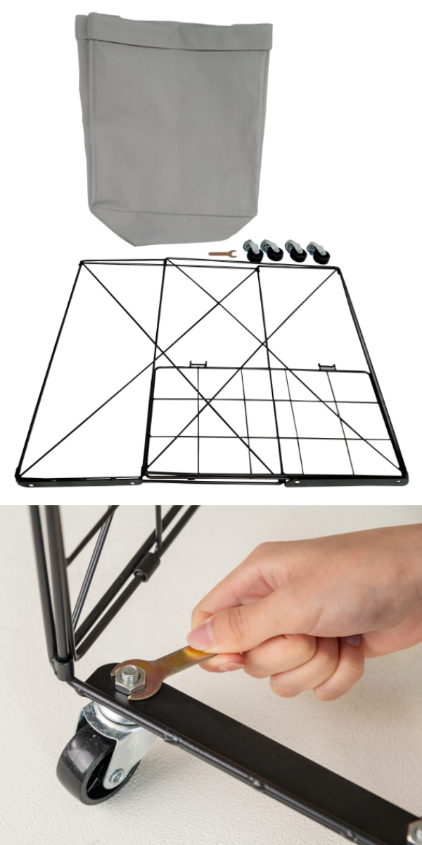 フレームにバッグをかぶせるだけで簡単に組み立てられます。キャスターは付属のスパナで取り付けられます。