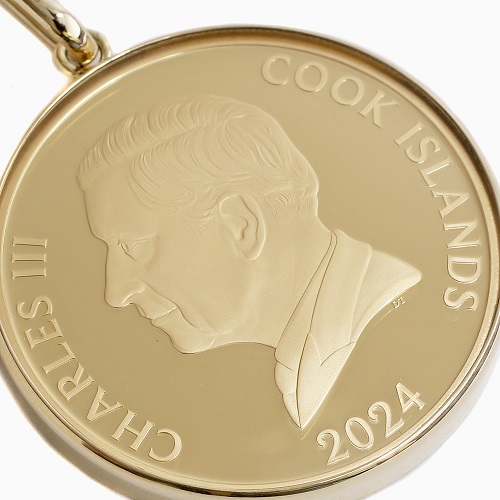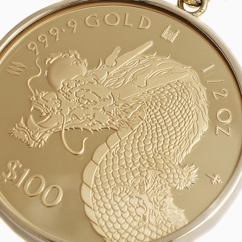 英国ロイヤルミント鋳造、純金ドラゴンコインに18金のシンプルガラス付フセコミ枠を巻いたコインペンダントトップ。