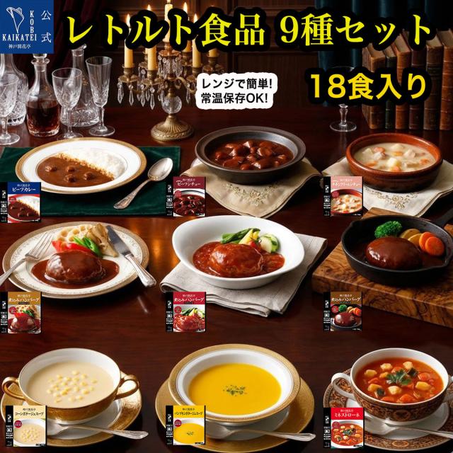 レトルト食品 惣菜 詰め合わせ 9種18個 セット ハンバーグ ビーフカレー シチュー スープ 神戸開花亭 常温保存 洋食 おかず レンジ対応 湯煎 温めるだけ 自宅用 一人暮らし 仕送り 非常食 保存食 備蓄 送料無料 のし包装不可 簡易梱包 母の日
