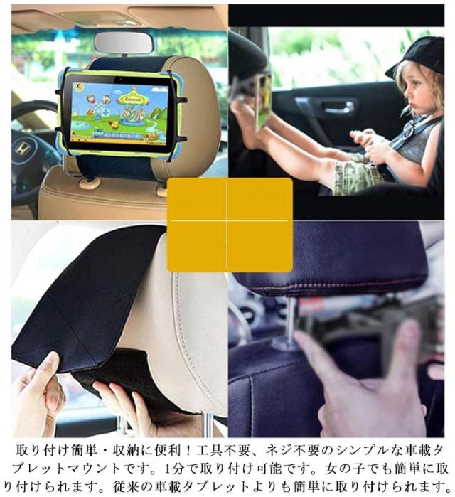 | ヘッドレストに装着!スマホ・タブレット兼用 車載ホルダー 取り付け簡単・収納に便利!工具不要、ネジ不要のシンプルな車載タブレットマウントです。1分で取り付け可能です。女の子でも簡単に取り付けられます。従来の車載タブレットよりも簡単に取り付けられます。 7-10.5インチ対応・ケース付きも使用可能。 大人も子供もタブレットで音楽、映画、カラオケなどを見て歌って楽しく長いドライブ時間を過ごすことができました。渋滞中も退屈することなく待ってられます。 | |