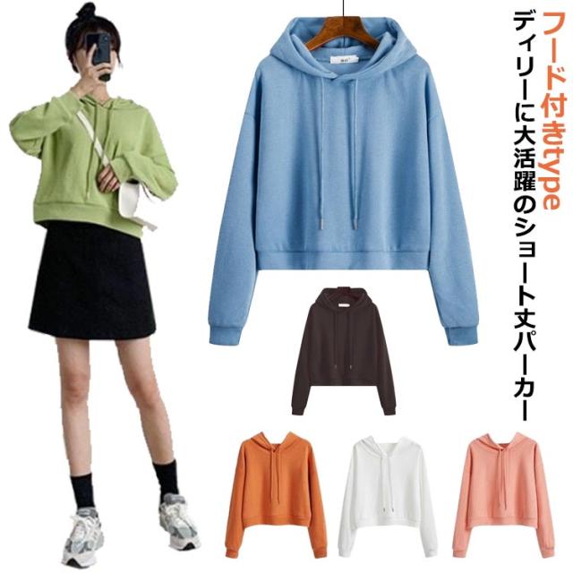 ショート丈 パーカー レディース ショート丈パーカー フード付き 長袖パーカー 長袖 パーカー カジュアル おしゃれ プルオーバー 無地 春秋 重ね着 トップス 薄手 春 秋 フード付きパーカー 大きいサイズ シンプル 可愛い 送料無料