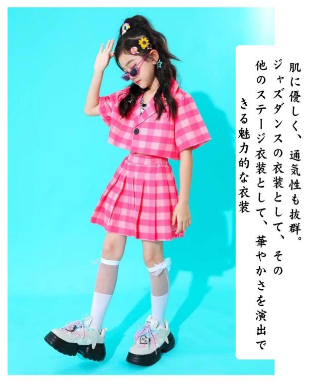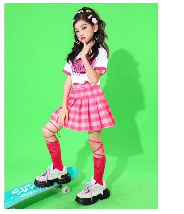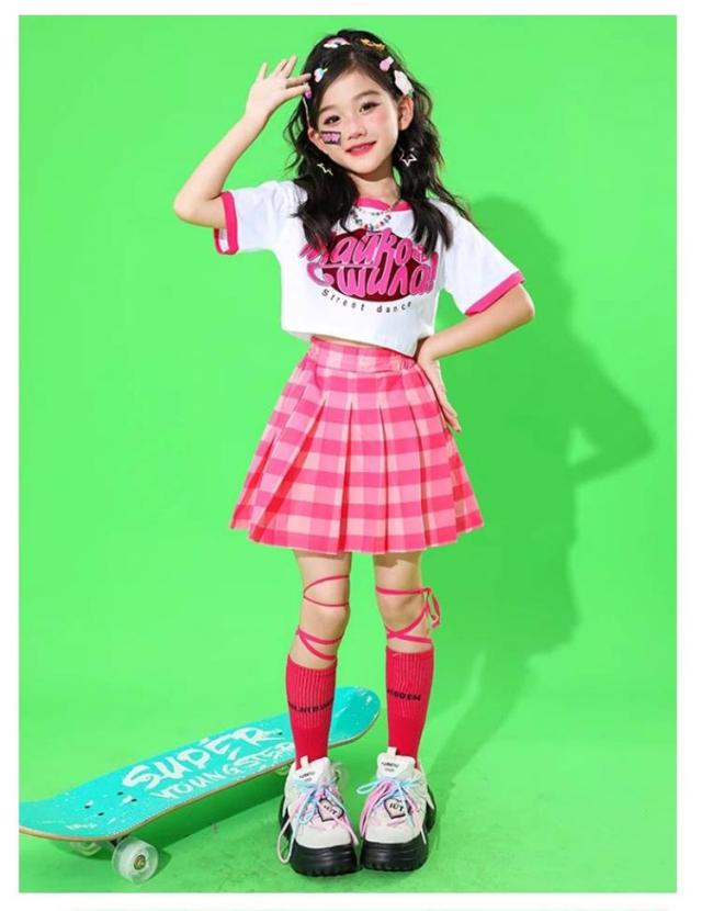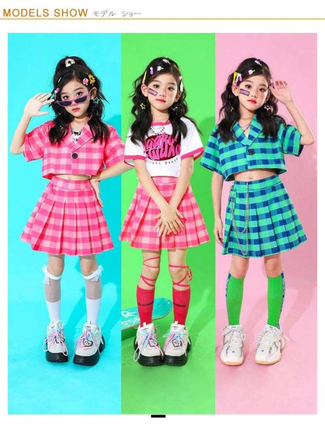 夏 新品 チアガール チェック柄 ミニスカート 女の子 キッズダンス衣装 セットアップ 上下セット Tシャツ 半袖 アウター ステージ衣装 韓国子供服 ショート丈 トップス 応援団 演出服 練習着 普段着 発表会 派手 ダンス衣装 hiphop K-pop 舞台 団体服 演出服