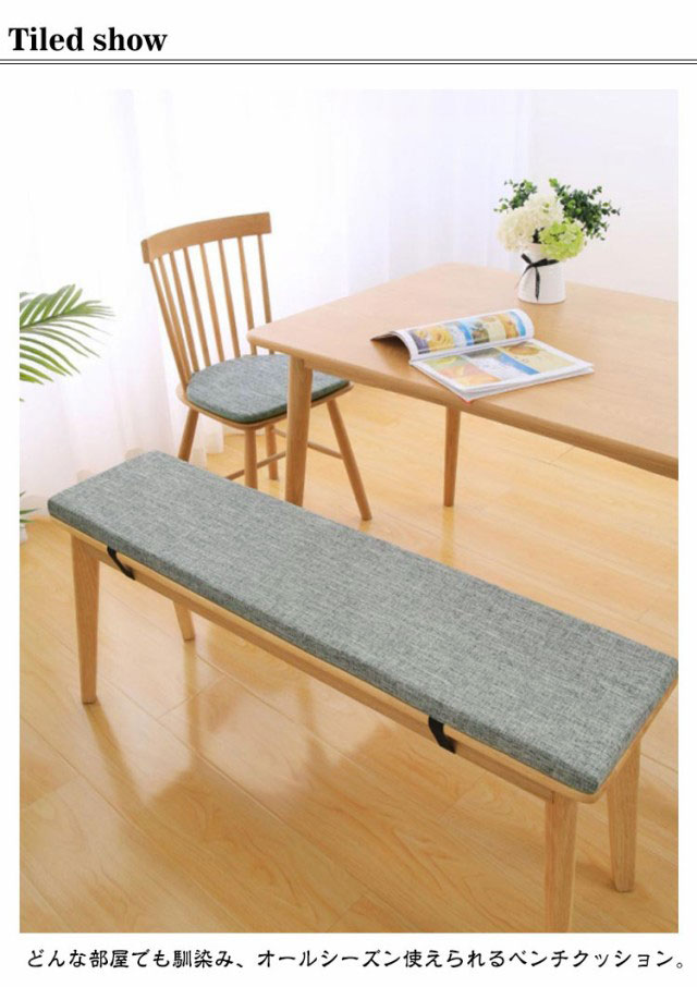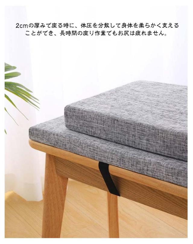 | 6サイズ×全11色!ベンチシートクッション どんな部屋でも馴染み、オールシーズン使えられるベンチクッション。 2cmの厚みで座る時に、体圧を分散して身体を柔らかく支えることができ、長時間の座り作業でもお尻は疲れません。 裏面は滑り止めと粘着防止のある粒子状の素材を採用し、座布団が椅子などから落ちる心配もないです。 高密度のスポンジでできており、回復性がよく、身体を柔らかく支えることができます。 カバーはファスナー仕様で、汚れたらすぐ取り外して洗濯機で洗えます。 ベルトがあるので、椅子にしっかりと固定されて移動しにくい。 ふかふか生地で座り心地良い、寒い日でも冷たさを感じず、心地よい温もりが広がります。 周りの家具とバランス良く馴染んでいます。部屋の模様替えやインテリア飾りとしてぴったり。 | |