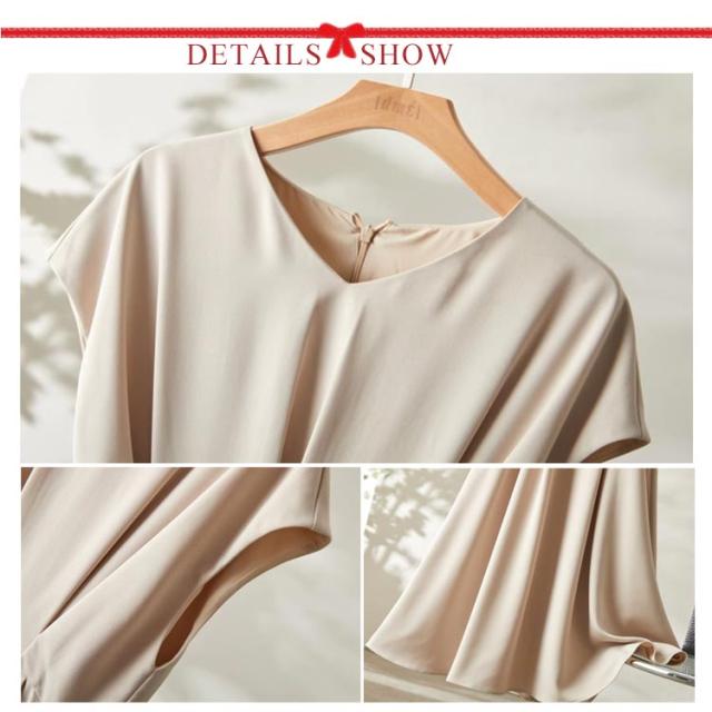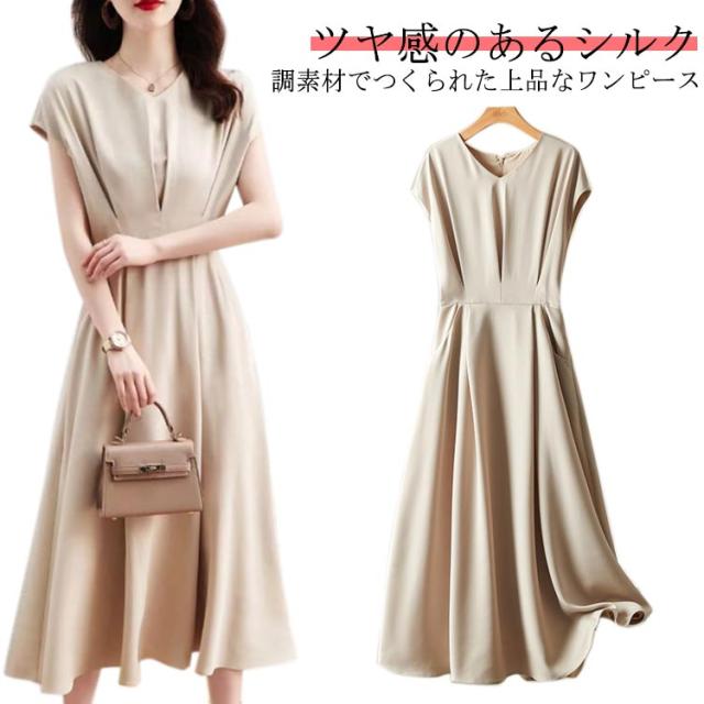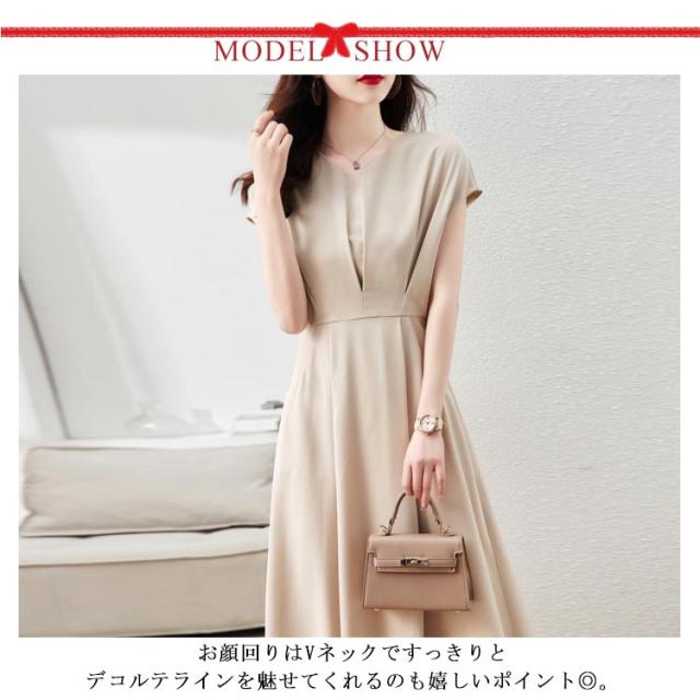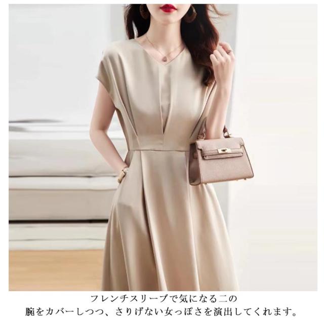 入学式 ロングワンピース セレモニー 上品 オフィス 送料無料 ワンピース ドレス フレンチスリーブ ミモレ丈 レディース キレイめ シルク調 Vネック OL 通勤 卒業式 半袖 ワンピ 発表会 春夏 20代 30代 40代 フレアワンピース
