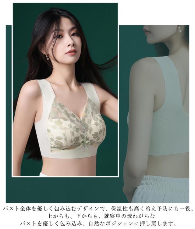 | 新作! 同色2枚セット! カップはズレ防止で、ブラ全体と一体化。 カップの下側には、バストを支える カップの上側には深めのストレッチレースで、動いてもパカパカしにくく、キレイな谷間をキープします。 バスト全体を優しく包み込むデザインで、保温性も高く冷え予防にも一役。 上からも、下からも、就寝中の流れがちなバストを優しく包み込み、自然なポジションに押し戻します。 ホックやスナップなし。シームレスデザインと幅広なホールドポイントで「肩」や「脇」「肋骨上まわり」等、上半身への負担を軽減し、深い眠りを邪魔しません。 | |