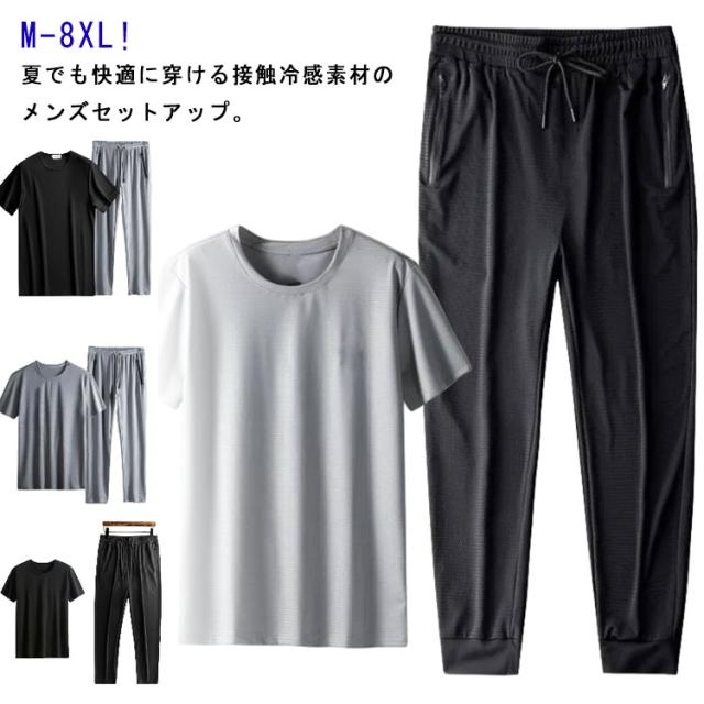 涼しい ジャージ スウェット ルームウェア プルオーバー 上下セット セットアップ 冷感接触 メンズ ワイドパンツ ロングパンツ サマーセット ビッグシルエット 半袖Tシャツ アイスシルク 大きいサイズ 部屋着 半袖 韓国 ストレッチ 春夏 カジュアル