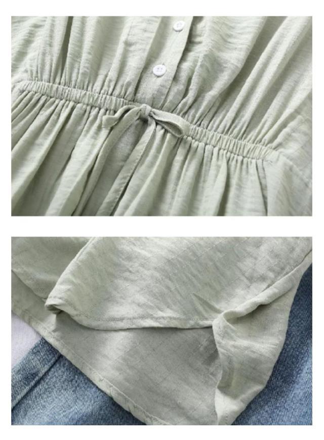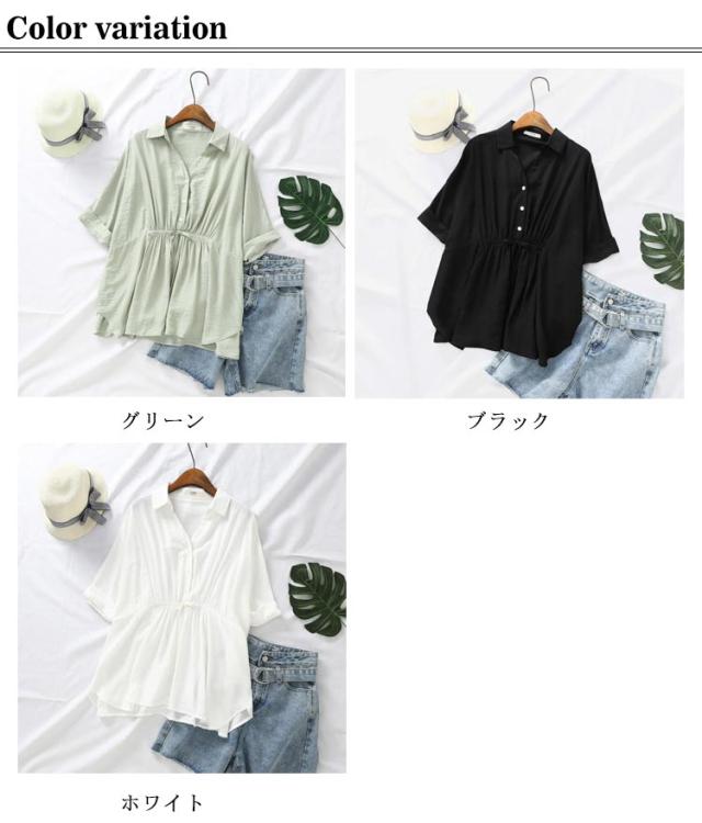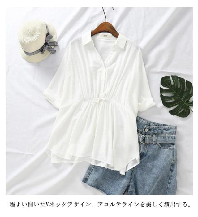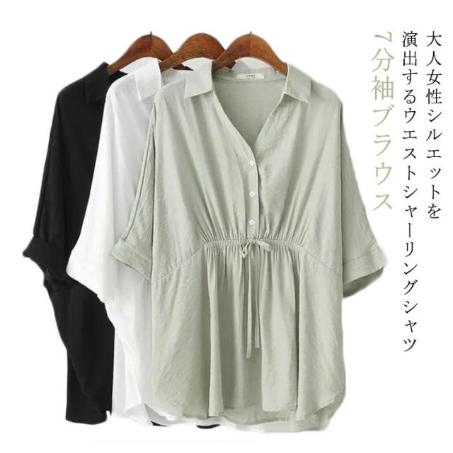 フレア シャツ 7分袖ブラウス 7分袖ブラウス ブラウス 薄手 ウエストシャーリングシャツ ボタン 春服 体型カバー レディース トップス 着?せ Vネック 長袖 無地 ギャザー シャーリング ナチュラル 春服 秋服 大きいサイズ 大人女性 可愛い 通勤