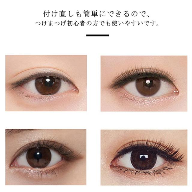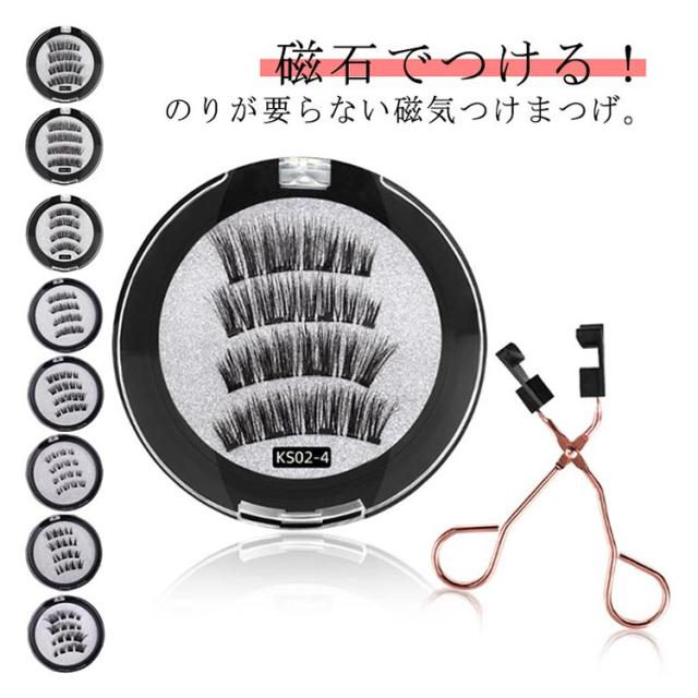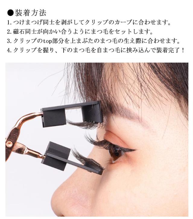 | 磁石でつける!のりが要らない磁気つけまつげ。 接着剤不要!わずか3秒で美しく自然なまつげを実現できます。 風や水にも強い!水に濡れても平気◎ 大風にも外れない! 付属の専用カーラーにもマグネットが付いていて取り付けも簡単、一瞬でフィットするので超時短です。 まつげの上下を磁石で挟み込み、ナチュラルながらもボリューム感のあるまつげで目元がパッチリします。 付け直しも簡単にできるので、つけまつげ初心者の方でも使いやすいです。 8種のまつげパターンから選べるのでナチュラルな仕上がりです。 ●装着方法 1.つけまつげ同士を剥がしてクリップのカーブに合わせます。 2.磁石同士が向かい合うようにまつ毛をセットします。 3.クリップのtop部分を上まぶたのまつ毛の生え際に合わせます。 4.クリップを握り、下のまつ毛を自まつ毛に挟み込んで装着完了! | |