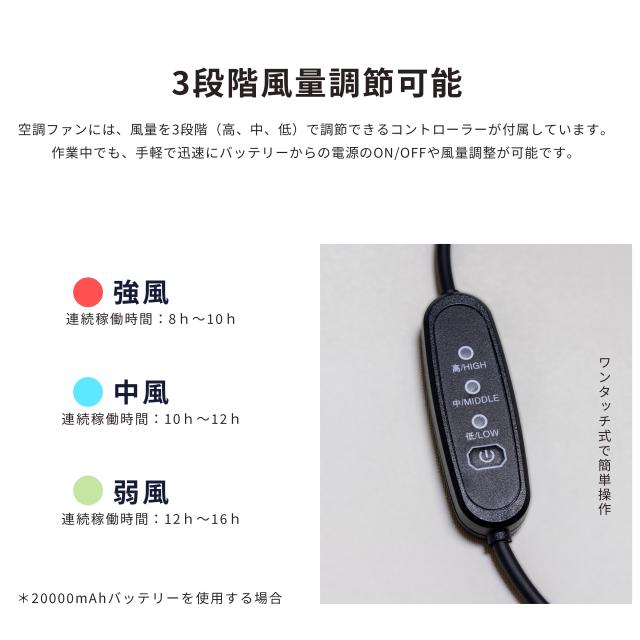*9枚の大面積羽根が均一に気流を割で、低騒音で風量UP!涼風を作ってくれます。風量が3段階と切り替えます。USB型ファン:USB給電なので、専用バッテリーだけでなく、モバイルバッテリーも使用可能です。夏の幅広い現場作業において、疲労軽減、作業効率の向上、熱中 症対策にも効果あります。