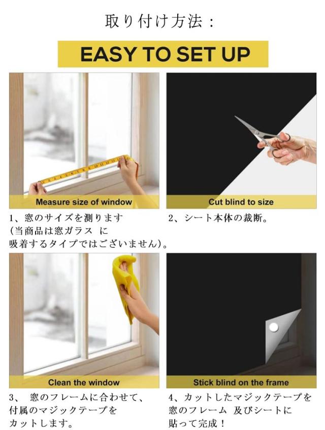 | 貼るだけで 遮光 遮熱シート。繰り返し使用可! 紫外線カット対策!家具や床材の変色・劣化を抑える効果も! 汚れや水滴がサッと拭き取れます。 裁断自由の切りやすい素材。窓の形に合わせてカットしてカーテンよりスペース取らず 簡単に目隠しできます。 マジックテープで窓に貼るだけの簡単設置。 取り付け方法: 1、窓のサイズを測ります(当商品は窓ガラス に吸着するタイプではございません)。 2、シート本体の裁断。 3、 窓のフレームに合わせて、付属のマジックテープをカットします。 4、カットしたマジックテープを窓のフレーム 及びシートに貼って完成! | |