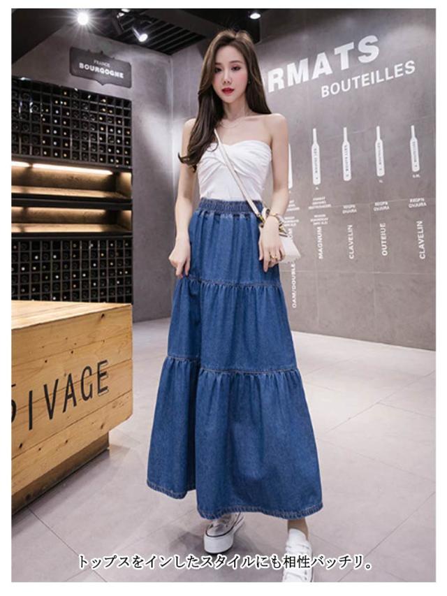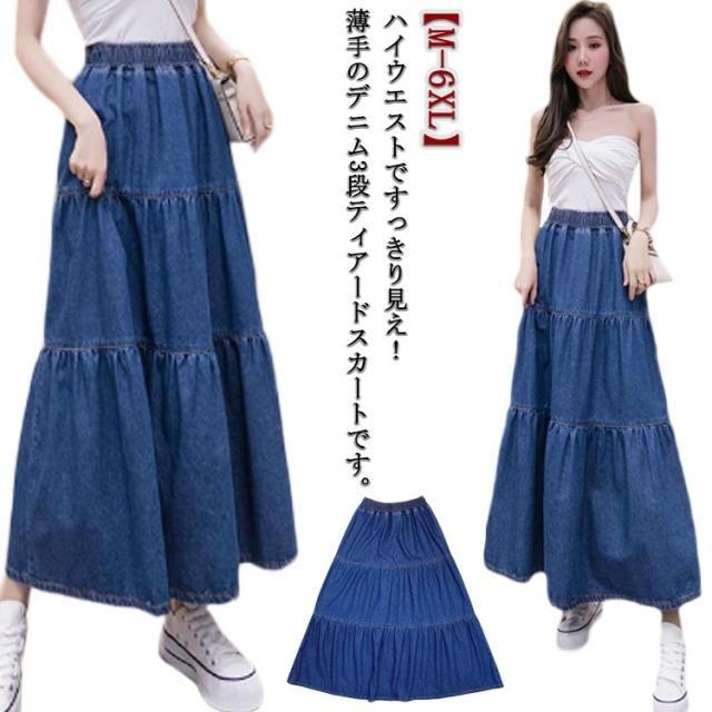 Aライン フレアスカート ティアード ゆったり 体型カバー 無地 マキシ丈スカート ハイウエスト 柔らか ボトムス ロングデニムスカート デニムスカート 夏 大きいサイズ ウエストゴム カジュアル マキシ丈スカート おしゃれ