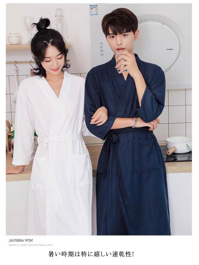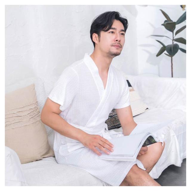 | やわらかな肌触りのワッフル地を使用したバスローブ。 【選べる長袖・半袖】 お風呂上りに、サッと羽織って湯冷め防止に。 また、ゆったり過ごしたいリラックスタイムのガウンとしても。 ワッフル素材なので、肌に触れる面積が少なく、さらっとした着心地です。 暑い時期は特に嬉しい速乾性! 両サイドにポケット付き。 結婚お祝いのペアギフトとしても人気となっております。 | |