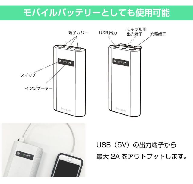 出力電圧:14.4V USB出力:DC5V 充電池:リチウムイオンバッテリー 寸法:幅86x高さ162x厚み30mm 容量:6900mAh 重量:650g |