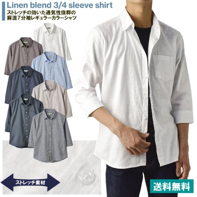 送料無料!ストレッチの効いた通気性抜群の麻混7分袖レギュラーカラーシャツ