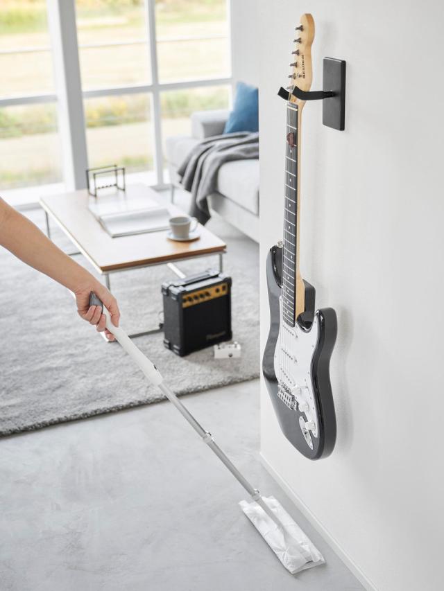 壁から浮かせて収納できるので、楽器や壁をキズつける心配がありません。厚みのあるアコースティックギターも壁から離して収納することができます。壁に掛けるだけで見た目もスッキリと収納できます。