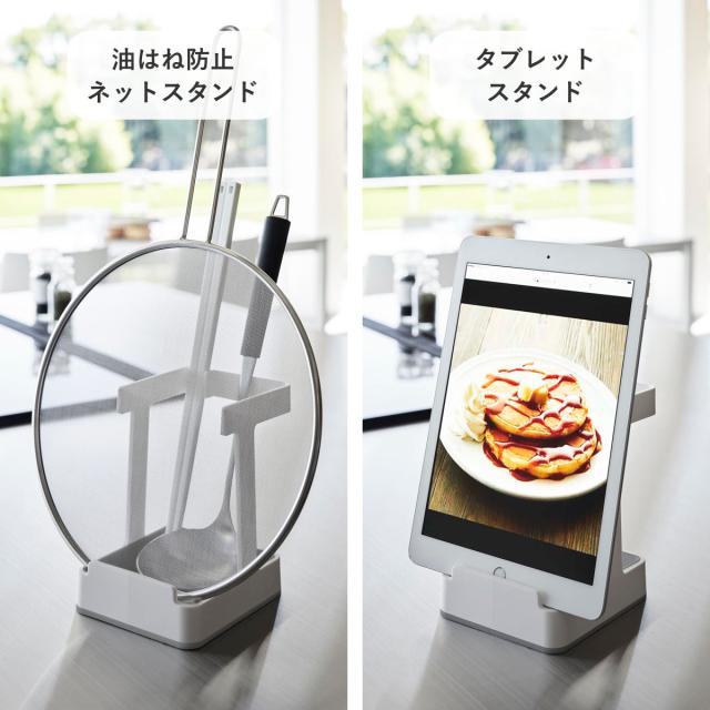 お玉や鍋蓋以外にも、油はね防止ネットなども立て掛けることができます。また、タブレットスタンドとしても使えるので、レシピを見ながらお料理したい方にも最適です。