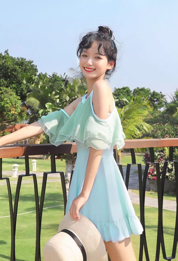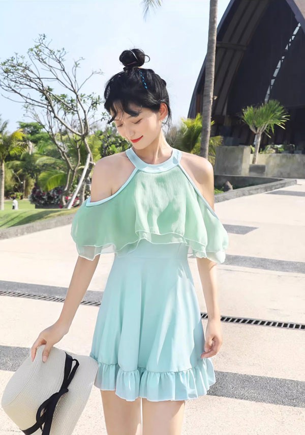 ワンピース水着 水着 2点セット 肩出し フリル ワイヤーなし パッド付 レディース 着?せ 服みたいな シンプル セクシー かわいい