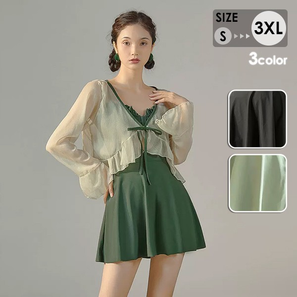 ワンピース水着 水着 レディース 2点セット 長袖 透け感あり フリル リボン ワイヤーなし パッド付 無地 着?せ 体型カバー ぽっちゃり シンプル 写真映え 撮影用 海 夏 サマー プール リゾート かわいい 旅行 温泉 大人 女性用 ジュニア 学生 女の子 ダークグリーン ブラック ライトグリーン