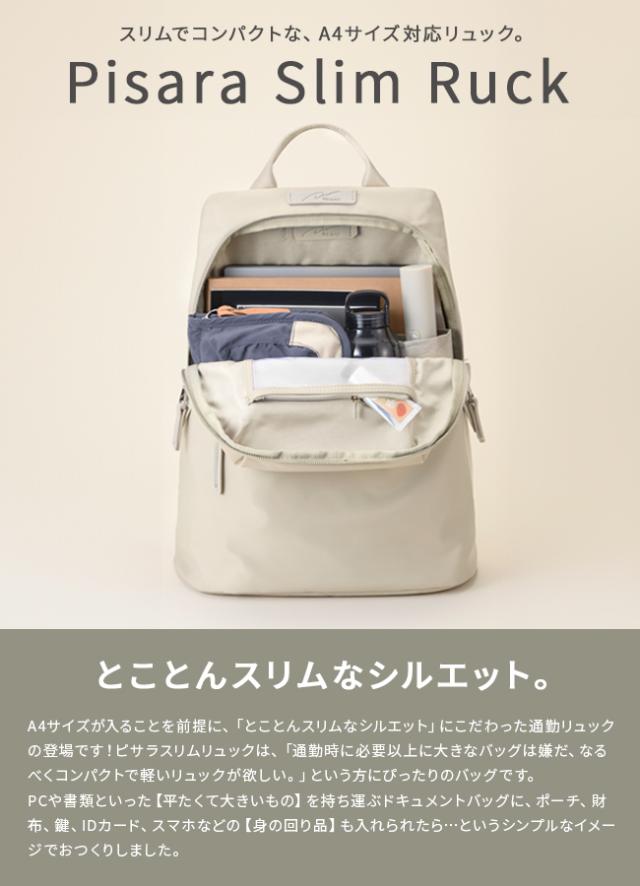 | スリムでコンパクトな、A4サイズ対応リュック。 A4サイズが入ることを前提に、「とことんスリムなシルエット」にこだわった通勤リュックの登場です! ピサラスリムリュックは、「通勤時に必要以上に大きなバッグは嫌だ、なるべくコンパクトで軽いリュックが欲しい。」という方にぴったりのバッグです。 PCや書類といった【平たくて大きいもの】を持ち運ぶドキュメントバッグに、ポーチ、財布、鍵、IDカード、スマホなどの【身の回り品】も入れられたら… というシンプルなイメージで、おつくりしました。 ご要望の多かった「使っている時の形崩れが気になる」という意見を参考に、荷物を入れて背負った時に形崩れしにくいデザインになっているので、すらっとした印象そのままに持ち運べるのも嬉しいポイントです。 |
