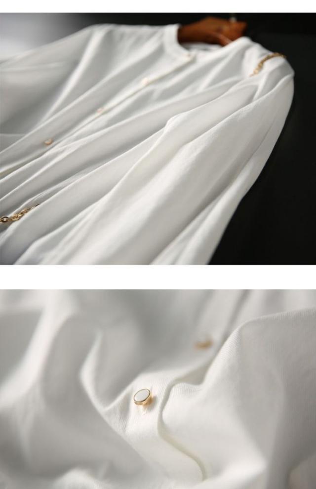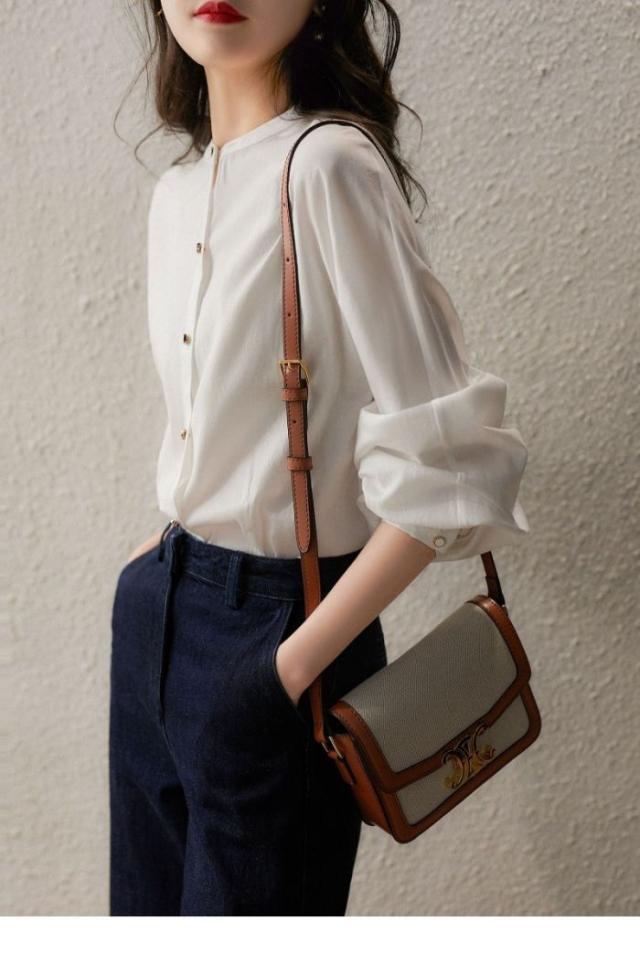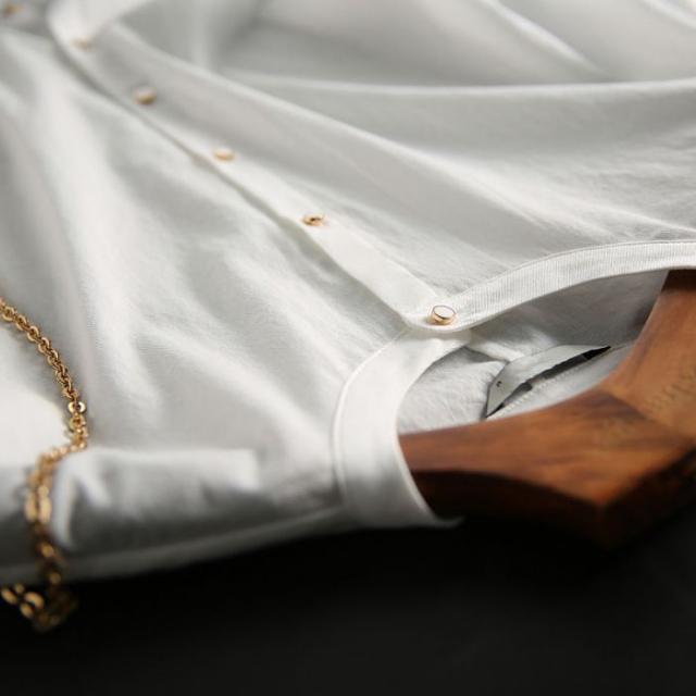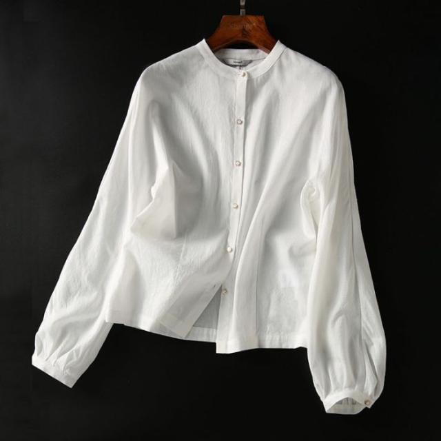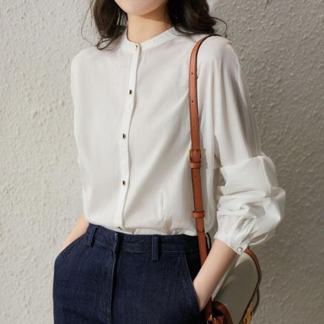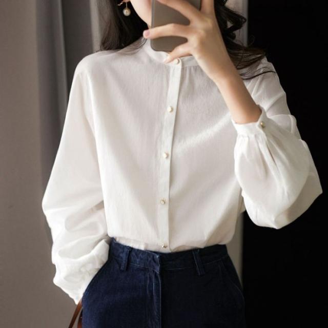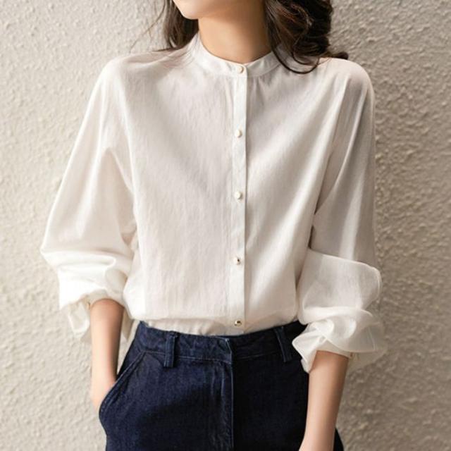 シャツ スタンドネック レディース 春秋 トップス 無地 長袖 ホワイト 綿 シンプル エレガント 通勤 OL