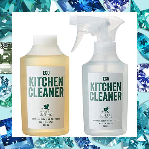 スプレーとリフィルセット キッチンクリーナースプレー 商品サイズ (幅×奥行×高さ) :44mm×85mm×173mm 原産国:日本 内容量:200ml キッチンクリーナーリフィル 商品サイズ (幅×奥行×高さ) :44mm×63mm×131mm 原産国:日本 内容量:200ml 商品紹介 コンロ・レンジ・グリル・オーブン・食器洗浄機・換気扇など、台所回りのお掃除はこれ1本で完結! 抗菌効果のある青森ヒバ(ヒノキの一種)のエッセンシャルオイル入りで、コンロやグリルなどの消臭効果もバツグン。リフィルは濃縮タイプでスプレー16本分! こびりついたひどい汚れには原液を使用すれば汚れをすっきり落とします。 原材料・成分 洗浄成分:高級アルコール (非イオン) 9%未満、ヤシ油脂肪酸アルカノールアミド7%未満 香り成分:天然精油 (青森ヒバ) 1%未満 その他:水83%以上 ECO KITCHEN CLEANER 強さの秘密は木の香り 洗浄成分である界面活性剤をわずか1%に抑え、そこに香り成分を加えた残りの98%以上は水でできたグリーンモーションのクリーナーシリーズ。 エコキッチンクリーナーは、しつこい油汚れをスッキリ落とす台所用クリーナーです。