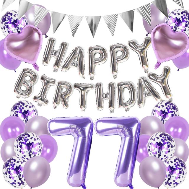 〔豪華なセット内容〕「77」数字バルーン×各1個、「HAPPY BIRTHDAY」文字バルーン×1組、フラッグガーランド×1本、紙吹雪入りバルーン×8個、パープルバルーン×7個、ライトパープルバルーン×7個、ハート型バルーン×2個、おまけ:リボン×2個、ドットシール×2枚。※商品の取り扱いは6才以上のお子様にお勧めします。ガーランドはお客様自身で糸通しをお願い致します。バルーン類は全て空気の入ってない状態でのお届けです。お届け後ご自身で膨らませてご使用下さい。