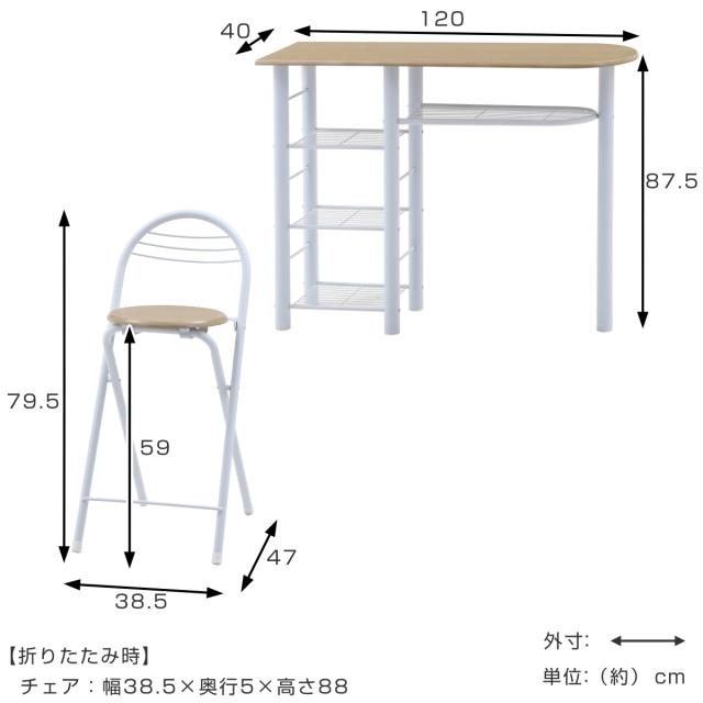 | サイズ | テーブル:約 幅120×奥行40×高さ87.5(cm) チェア:約 幅38.5×奥行47×高さ79.5(cm) 座面高:45(cm) |