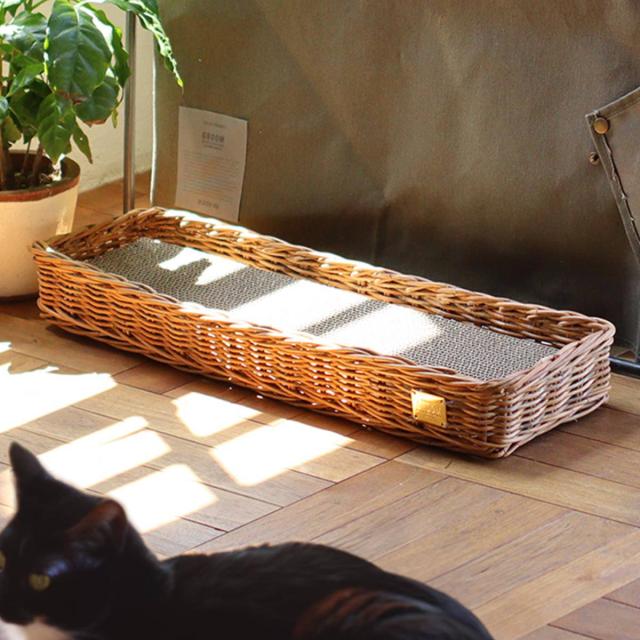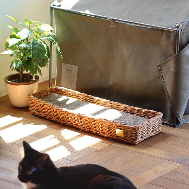 市販の段ボール爪とぎをセットして使用する、爪とぎ用のバスケットです。素朴でナチュラルな風合いはインテリアに馴染みやすいです。