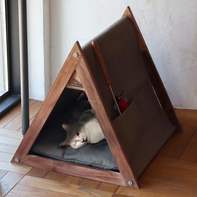 三角形のデザインが印象的なテント型猫ベッドです。秘密基地のような形がかわいいテントは、外からの視線を程よく隠します。薄暗く静かな場所が好きな猫ちゃんにぴったりです。