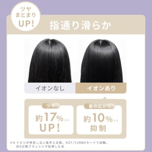 ※4 イオンが発生しない条件と比較、HOT/TURBOモードで試験。約5分間ブラッシング処理した毛髪のツヤ(光沢度)とまとまり(広がり具合)を測定(アイリスオーヤマ調べ)
