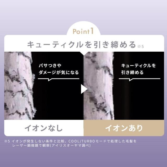 ※5 イオンが発生しない条件と比較、COOL/TURBOモードで処理した毛髪をレーザー顕微鏡で観察(アイリスオーヤマ調べ)