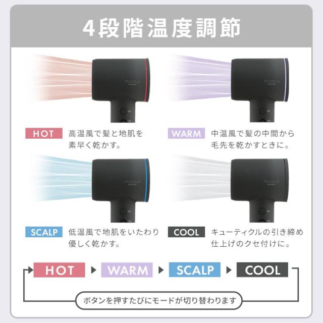 ●4段階温度調節:HOT:高温風で髪と地肌を素早く乾かす。WARM:中温風で髪の中間から毛先を乾かすときに。SCALP:低温風で地肌をいたわり優しく乾かす。COOL:キューティクルを引き締め、仕上げのクセ付けに。