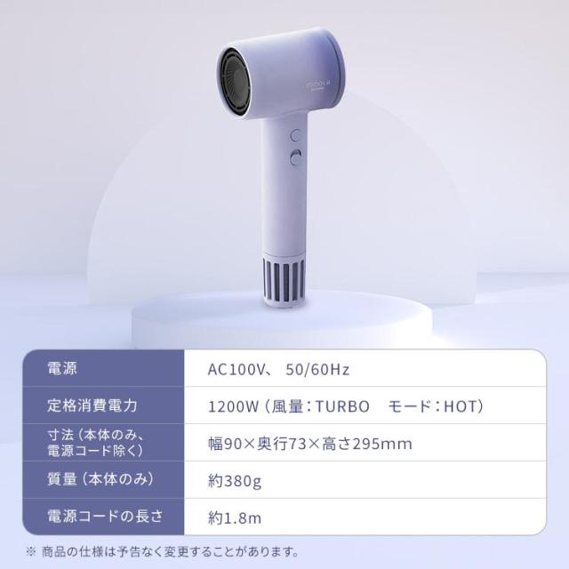 | ・商品サイズ(cm)(本体のみ、電源コード除く)幅約9×奥行約7.3×高さ約29.5 ・製品質量(本体のみ):約380g ・定格電源:AC100V、50/60Hz ・定格消費電力:1200W(風量:TURBO、モード:HOT) ・風量(TURBO時・ノズルなし):4.1m3/分 ・電源スイッチ:TURBO/SET/OFF ・切り替ボタン(本体ランプ色:モード):赤:HOT高温風で髪と地肌を素早く乾かしたいときなどに、ピンク:WARM中温風で髪の中間から毛先を乾かすときなどに、青:SCALP低温風で地肌をいたわりながら優しく乾かしたいときなどに 点灯無し:COOLキューティクルを引き締め、クセづけなどの仕上げに ・電源コードの長さ:約1.8m ・付属品:先端ノズル ・カラー:ダークグレー |
