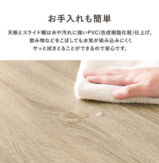収納スペースに合わせて幅を調整できるカウンターキャビネット。スライド棚には2口コンセントが付いており、作業台としても使いやすい高さがポイント。